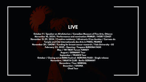His sound is new yet rooted in the familiar—an electrifying blast from a future born of ancestral greatness. Electric guitar, pulsating live percussion, and cutting-edge digital art, his music is a sonic mosaic of Africa’s legendary artists. Saharan Electro, Afrotronix’s signature vibe, drops a bold, Afro-futuristic pulse into urban fashion, wild dance floors—bursting with energy, style, and unstoppable African algorithms.